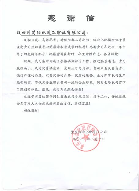 昨日,我司收到來自重慶江北化肥有限公司的感謝信,并被選為其年度“優(yōu)秀供應(yīng)商”。信中表彰了我司過去一年為江北化肥提供的支持與配合,并在其開展的合格供應(yīng)商評選中以“優(yōu)異的產(chǎn)品、優(yōu)質(zhì)的服務(wù)”的良好形象被評為“優(yōu)秀供應(yīng)商”。