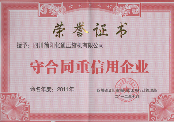 為推進(jìn)我市企業(yè)信用體系建設(shè),按照國家工商行政管理總局《關(guān)于深入開展“守合同重信用企業(yè)”合同的若干意見》的規(guī)定、《四川省“守合同重信用企業(yè)”考核認(rèn)定辦法》的標(biāo)準(zhǔn)。企業(yè)自愿申請(qǐng),經(jīng)資陽市簡(jiǎn)陽市工商行政管理局征求有關(guān)部門和社會(huì)各界意見,認(rèn)真考核認(rèn)真考查,嚴(yán)格審核,現(xiàn)授予四川簡(jiǎn)陽化通壓縮機(jī)有限公司2011年度簡(jiǎn)陽市級(jí)“守合同重信用企業(yè)”稱號(hào)。