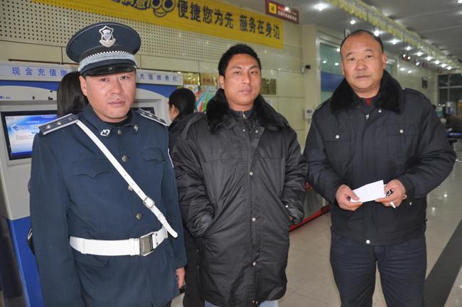 失主(右)與保安員段二偉(左)、保安副隊長童新義(中)合影