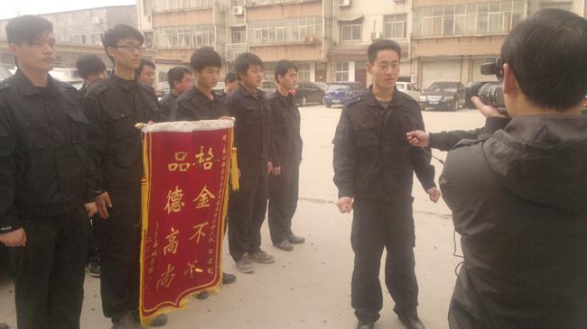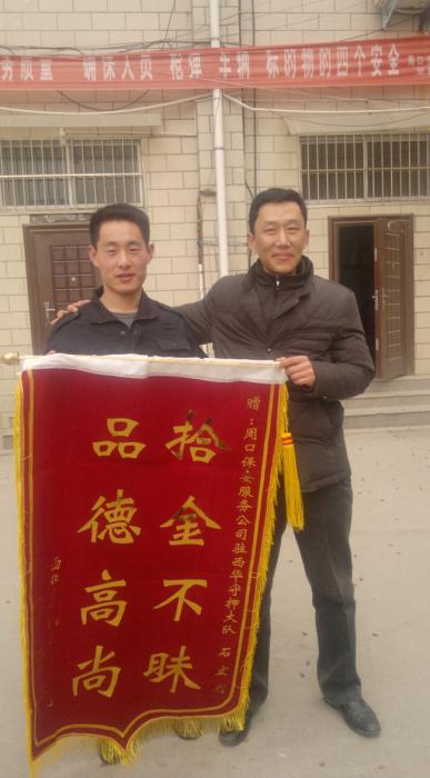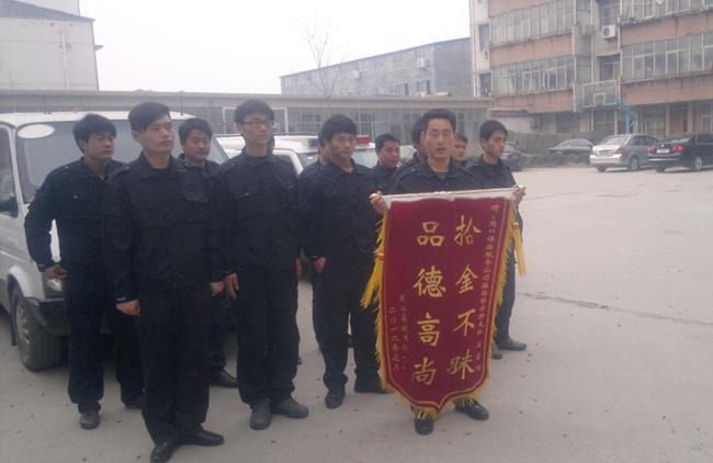 3月12日下午, 周口市保安服務(wù)公司駐西華押運(yùn)大隊(duì)駐地鞭炮齊鳴,一面寫(xiě)有"拾金不昧,品德高尚"的錦旗被送到該大隊(duì)負(fù)責(zé)人陳思宇的手中,以此表達(dá)對(duì)該大隊(duì)員工拾金不昧的感激之情。