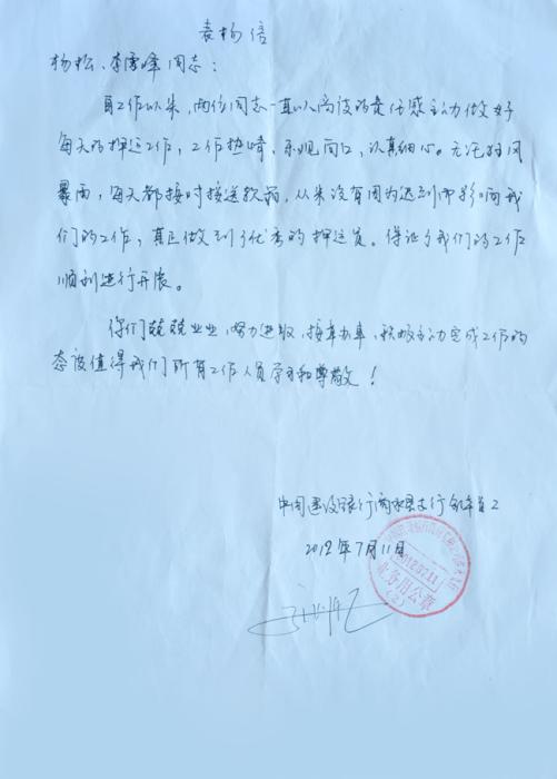 近期,中國(guó)建設(shè)銀行商水縣支行向公司押運(yùn)二大隊(duì)寄來(lái)表?yè)P(yáng)信,對(duì)押運(yùn)二大隊(duì)楊松、李雪峰兩位同志的先進(jìn)事跡給予表?yè)P(yáng)。
