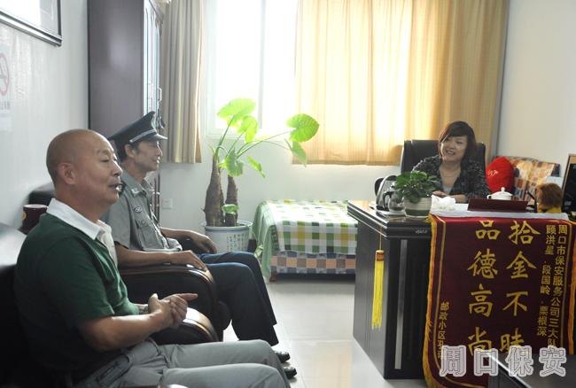 9月25日,周口保安服務公司人防中心談笑風生,氣氛熱烈,一面書有“拾金不昧 品德高尚”的錦旗格外鮮艷奪目。