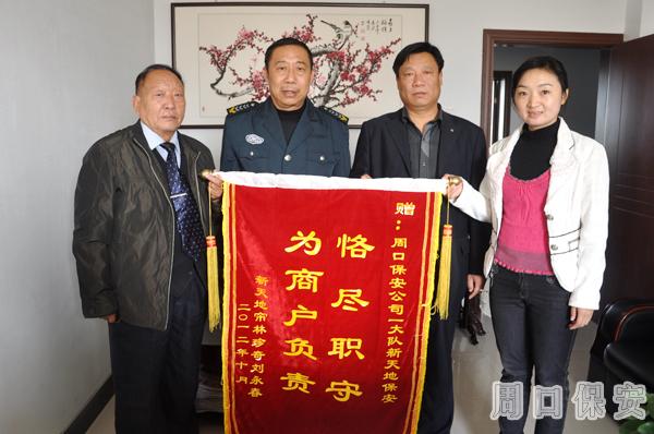 2012年10月24日,周口市保安服務(wù)公司喜氣洋洋,掌聲一片,人防新天地崗點“簾林珍奇”店主李永春向公司送來錦旗,對新天地保安認(rèn)真負(fù)責(zé),為商戶保駕護航的工作精神給予肯定。