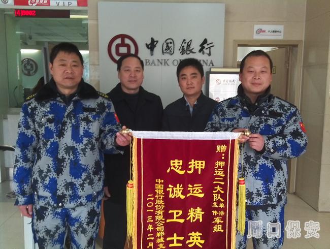 2013年3月4日,中國銀行鄲城支行支行張行長、胡主任專程趕到周口市給押運(yùn)公司送來“押運(yùn)精英  忠誠衛(wèi)士”的燙金字錦旗,表達(dá)對押運(yùn)二大隊(duì)單浩、孟偉車組一年來在押運(yùn)工作中,盡職盡責(zé),熱情周到服務(wù)的無比感謝之情。
