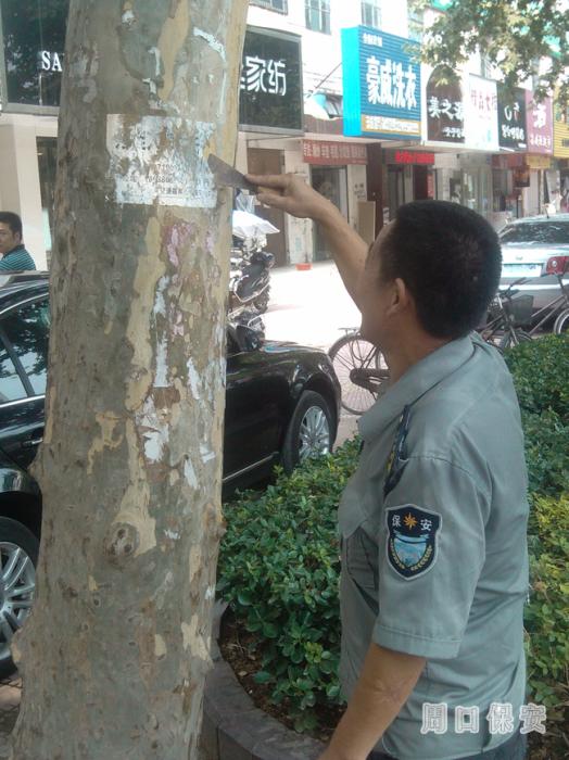 周口市保安服務(wù)按照市公安局《創(chuàng)建省級(jí)文明城市工作方案》要求,主動(dòng)響應(yīng),全體動(dòng)員,積極發(fā)揮保安隊(duì)伍點(diǎn)多、面廣、線長的優(yōu)勢(shì),緊密結(jié)合保安崗位實(shí)際,多次走上街頭,維護(hù)道路護(hù)欄,及時(shí)清理和擦拭街邊公共設(shè)施、墻壁、樹木上的小廣告,義務(wù)為我市創(chuàng)建省級(jí)文明城市優(yōu)良的自然環(huán)境和平安和諧的治安環(huán)境做出應(yīng)有貢獻(xiàn)。