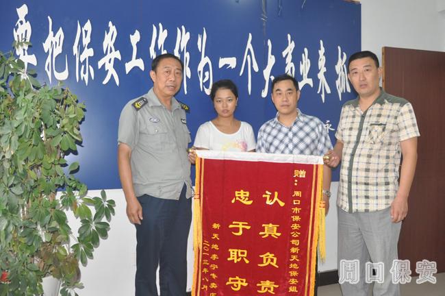 2013年8月27日上午,周口市新天地一個商戶到周口市保安服務公司送來錦旗一面,表達了對周口市保安服務公司新天地崗點執(zhí)勤保安員盡職盡責為商戶負責的精神的一份感激之情。